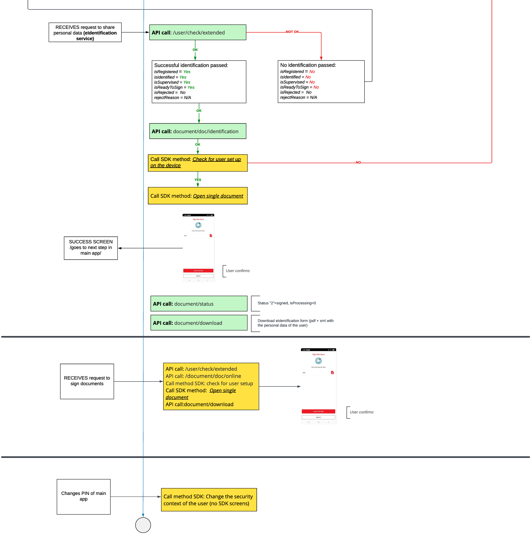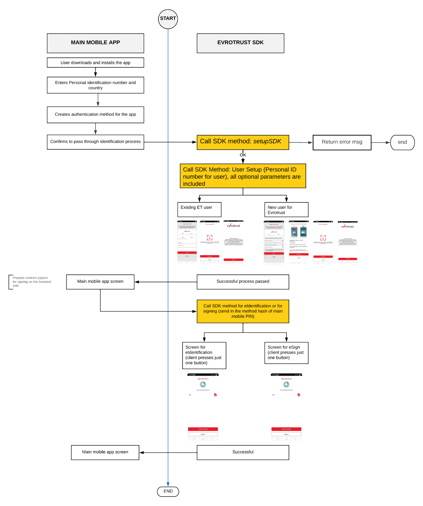 Understanding the complete workflow is essential for successful integration. This page visualizes the end-to-end processes for mobile SDK integrations both for Evrotrust eID as well as for Evrotrust Ident Lite, showing you exactly how users move through registration, verification, and authentication. Use these diagrams to plan your implementation, anticipate user interactions, and handle different scenarios effectively.