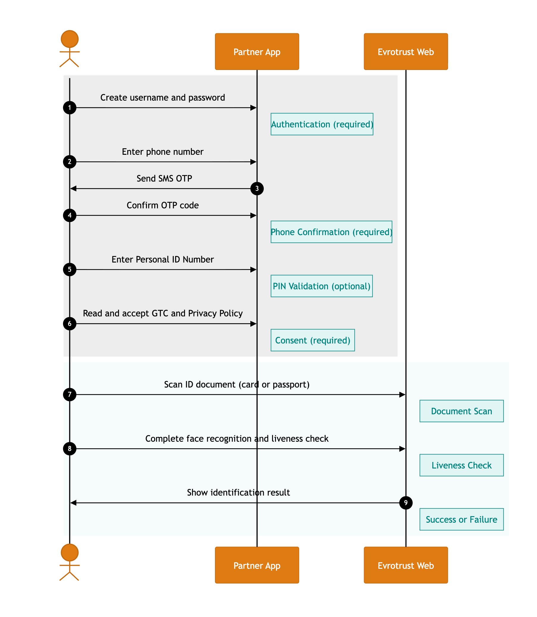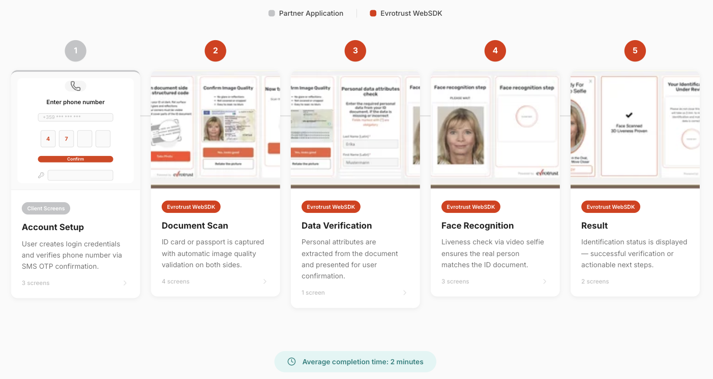 ℹ️ Steps 1 to 6 are hadled on your main application screens. Steps 7 to 9 are handled on Evrotrust Web SDK screens.